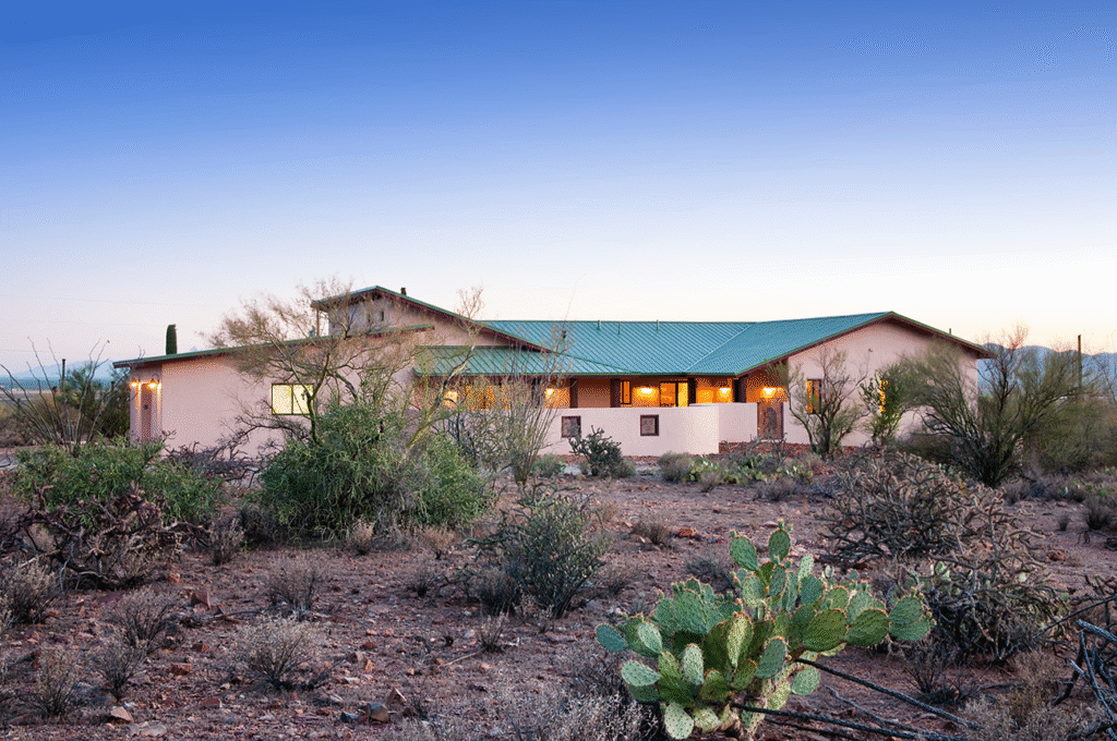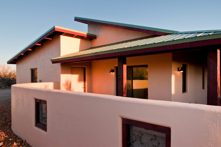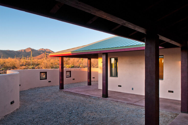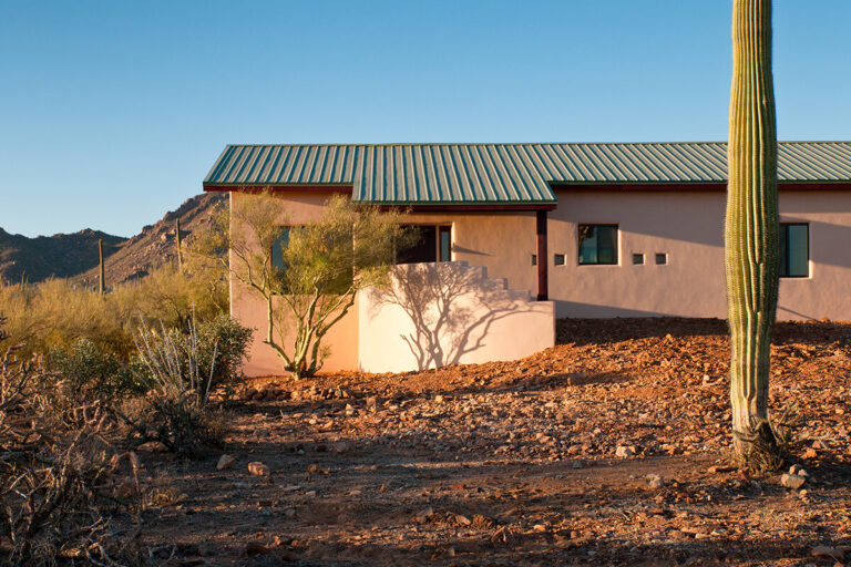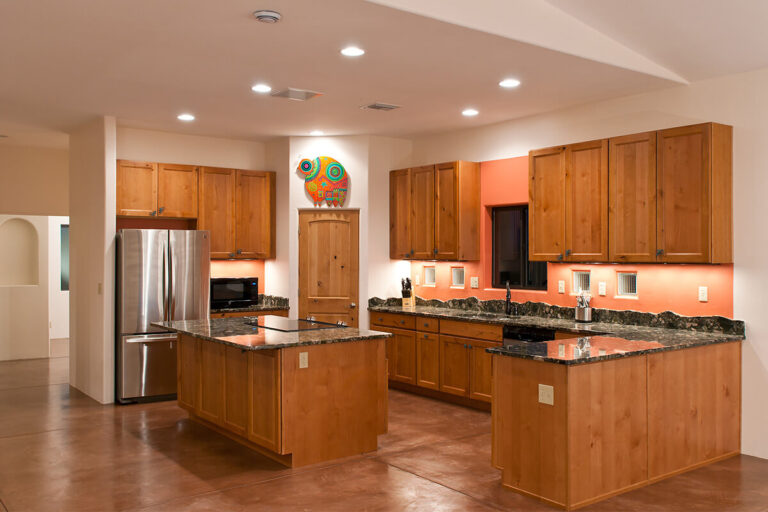 This Desert Earth and Wood design build home features insulated concrete form construction from recycled, earth-friendly block from Chandler, Arizona. The outdoor patio area became a focal point of the living space. The roof system made up of a combination of planes creates an interesting profile. Our clients requested that energy efficiency be central to the design, a goal that matches our philosophy of building. This home was designed with the Sonoran desert as a backdrop. All the components are natural materials and the open floor plan highlights the simple beauty of the kitchen. We incorporated glass block under the upper cabinets to bring in the wonderful light of the Arizona sun, and a custom-cut granite back splash that depicts the surrounding mountain profile.