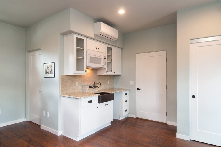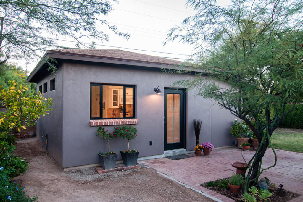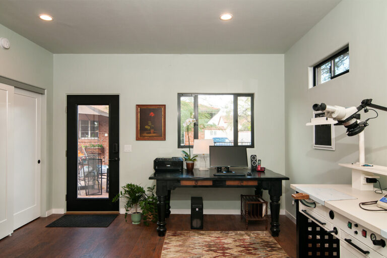 Desert Earth and Wood was contracted to design and build a studio apartment to replace an existing carport and shed. At the owner’s request, we incorporated part of the existing shed to become a storage and utility room for the new studio. Special considerations were required to accommodate the electrical needs of owner’s studio, including careful elevation design to best utilize the space for equipment placements. One feature requested by the owner was an open shower design. The small bath was designed as an open